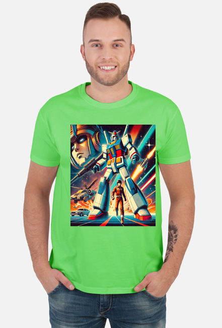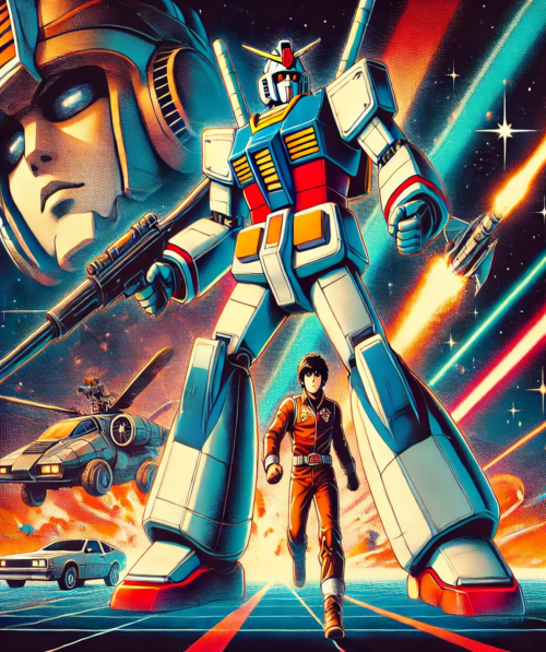 Grafika inspirowana klimatem Kapitana Daimosa! (General Daimos) Epicki mech w dynamicznej pozie, bohater gotowy do walki i retro anime vibes lat 70. i 80.