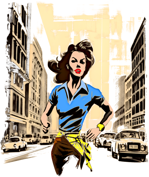 Ta bluza nie tylko dodaje stylu do Twojej garderoby, ale także zapewnia komfort i ciepło podczas chłodniejszych dni. Grafika przedstawiająca kobietę biegnącą przez miasto, uchwycona w stylu vintage, inspiruje do działania i podkreśla determinację.