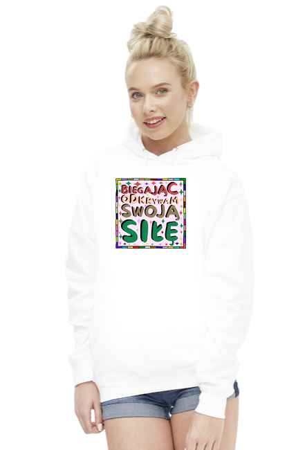 Bluza Damska z Kapturem - Inspirujący cytat o odkrywaniu swojej siły poprzez bieganie - kolorowa grafika motywacyjna SKU: bluz-z-kapturem-damska_qtqo65tb_4777794