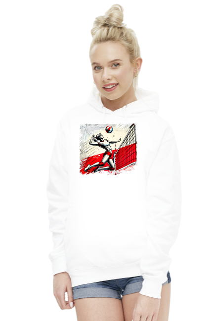 Dodaj wyjątkowy element do swojej garderoby dzięki mojej bluzie damskiej z kapturem, która charakteryzuje się unikalnym designem. Grafika na bluzie przedstawia polską siatkarkę w akcji, uchwyconą w momencie energetycznego uderzenia piłki nad siatką, na tle stylizowanej flagi Polski. Ten dynamiczny design, utrzymany w intensywnych odcieniach czerwieni, czerni i bieli, wyróżnia się pop-artowym stylem z elementami vintage graffiti, co nadaje bluzie unikalny charakter.