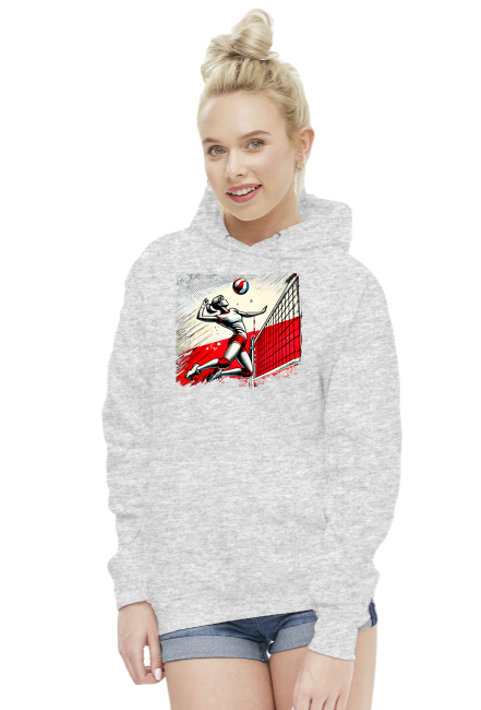 Dodaj wyjątkowy element do swojej garderoby dzięki mojej bluzie damskiej z kapturem, która charakteryzuje się unikalnym designem. Grafika na bluzie przedstawia polską siatkarkę w akcji, uchwyconą w momencie energetycznego uderzenia piłki nad siatką, na tle stylizowanej flagi Polski. Ten dynamiczny design, utrzymany w intensywnych odcieniach czerwieni, czerni i bieli, wyróżnia się pop-artowym stylem z elementami vintage graffiti, co nadaje bluzie unikalny charakter.