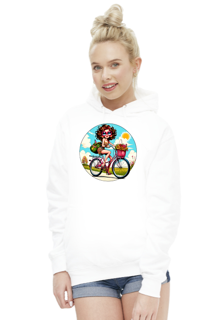 Bluza damska z kapturem "Stylowa dziewczyna na rowerze w stylu retro z koszem pełnym kwiatów" – modna kangurka o wysokiej jakości SKU: bluz-z-kapturem-damska_i0az99eg_4775718