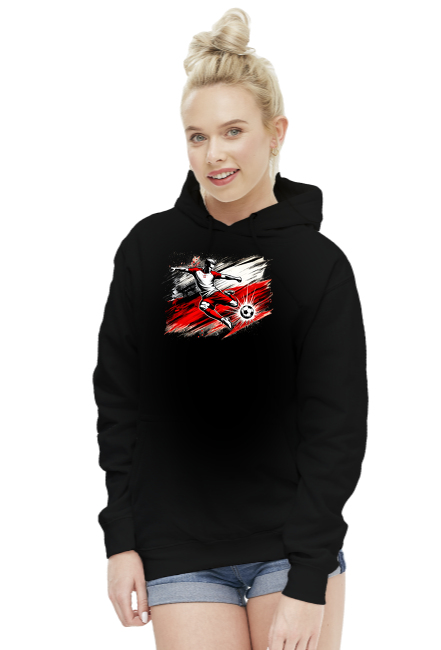 Bluza damska z kapturem z dynamiczną grafiką polskiego piłkarza w akcji na tle stylizowanej flagi Polski w stylu pop-art SKU: bluz-z-kapturem-damska_5qrt8obu_4776787