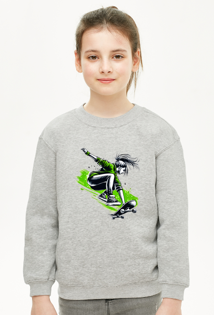 Bluza Dla Dziewczynek - Ekstremalna jazda na deskorolce: Skok dziewczyny w zielonej bluzie z artystycznym zielonym tłem SKU: dziewcz-ca-bluza-bez-kaptura_nfpwggs8_4777504