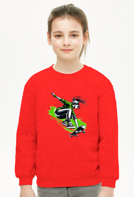 Bluza Dla Dziewczynek - Ekstremalna jazda na deskorolce: Skok dziewczyny w zielonej bluzie z artystycznym zielonym tłem SKU: dziewcz-ca-bluza-bez-kaptura_nfpwggs8_4777504