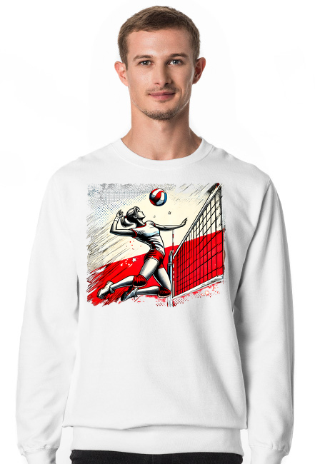 Dodaj sportowy akcent do swojej garderoby dzięki mojej klasycznej bluzie męskiej. Grafika na bluzie przedstawia polską siatkarkę w akcji, uchwyconą w momencie energetycznego uderzenia piłki nad siatką, na tle stylizowanej flagi Polski. Ten dynamiczny design, utrzymany w intensywnych odcieniach czerwieni, czerni i bieli, wyróżnia się pop-artowym stylem z elementami vintage graffiti, co nadaje bluzie unikalny charakter.