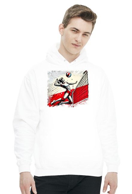 Wzbogać swoją garderobę o bluzę męską z kapturem z wyjątkowym designem. Grafika na bluzie przedstawia polską siatkarkę w akcji, uchwyconą w momencie energetycznego uderzenia piłki nad siatką, na tle stylizowanej flagi Polski. Ten dynamiczny design, utrzymany w intensywnych odcieniach czerwieni, czerni i bieli, wyróżnia się pop-artowym stylem z elementami vintage graffiti, co nadaje bluzie unikalny charakter.
