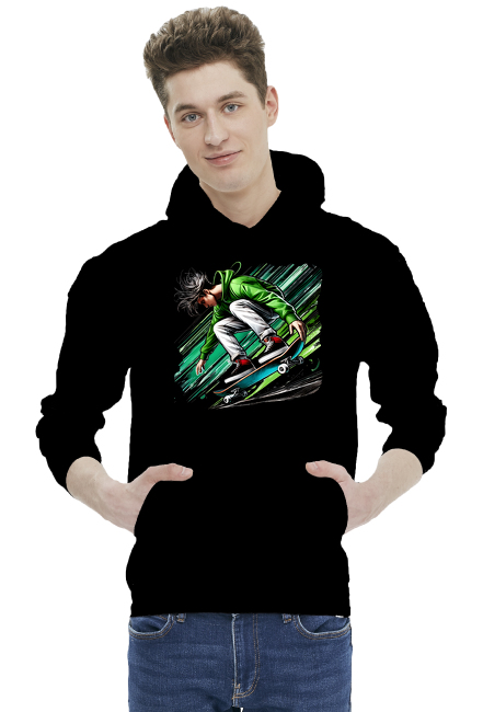 Bluza Męska z Kapturem Stylowy Chłopak w Zielonej Bluzie na Deskorolce – Dynamiczna Ilustracja SKU: Bluza-z-kapturem_cbf6t628_4777631