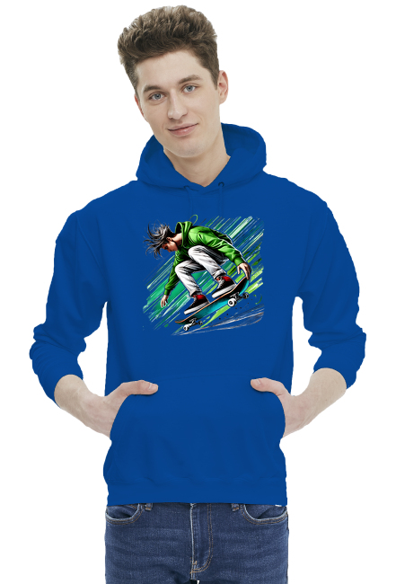 Odkryj moją bluzę męską z kapturem z dynamiczną ilustracją, przedstawiającą stylowego chłopaka w zielonej bluzie na deskorolce. Ta nowoczesna grafika jest pełna energii i ruchu, co sprawia, że bluza wyróżnia się wśród innych. Każdy projekt jest ręcznie tworzony, co zapewnia jego unikalny design i wyjątkowy charakter.