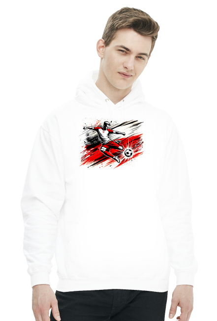 Bluza męska z kapturem z dynamiczną grafiką przedstawiającą polskiego piłkarza w akcji na tle stylizowanej flagi Polski w stylu pop-art to idealny wybór dla mężczyzn, którzy cenią sobie nowoczesny styl i unikalny design. Ta sportowa bluza wyróżnia się dynamiczną grafiką, która przyciąga wzrok i podkreśla pasję do piłki nożnej.