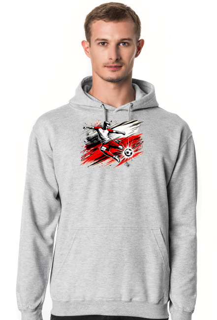 Bluza męska z kapturem z dynamiczną grafiką przedstawiającą polskiego piłkarza w akcji na tle stylizowanej flagi Polski w stylu pop-art to idealny wybór dla mężczyzn, którzy cenią sobie nowoczesny styl i unikalny design. Ta sportowa bluza wyróżnia się dynamiczną grafiką, która przyciąga wzrok i podkreśla pasję do piłki nożnej.