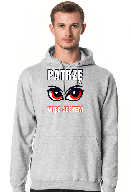 Bluza Męska z Kapturem z unikalną grafiką "Oko Mocy - Wizualna Ekspresja Bytu" to must-have dla każdego miłośnika niebanalnego stylu. Ta bluza łączy w sobie wyraziste oczy, inspirujący napis, oraz artystyczną wizualizację, tworząc niepowtarzalny plakat do noszenia na co dzień. Grafika przedstawia intensywne oczy, które symbolizują siłę i determinację, a napis "Patrzę Więc Jestem" dodaje głębi i motywacji.