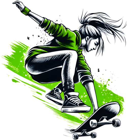 Ta wyjątkowa bluza z kapturem dla dziewczynek jest idealnym połączeniem stylu i sportowej pasji. Grafika zatytułowana "Ekstremalna jazda na deskorolce: Skok dziewczyny w zielonej bluzie z artystycznym zielonym tłem" przedstawia dynamiczną scenę skateboardingu, która przyciąga wzrok i inspiruje do działania. Wysokiej jakości nadruk z dziewczyną na deskorolce w zielonej bluzie na tle artystycznego, zielonego splashu jest zarówno nowoczesny, jak i pełen energii.