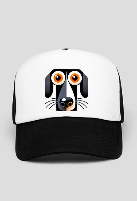 Przedstawiam moją wyjątkową czapkę z daszkiem typu TRUCKER, ozdobioną czarno-szarym psem z dużymi pomarańczowymi oczami. Ta unikalna ilustracja psa została stworzona z myślą o wszystkich miłośnikach zwierząt, którzy cenią sobie oryginalną sztukę cyfrową.