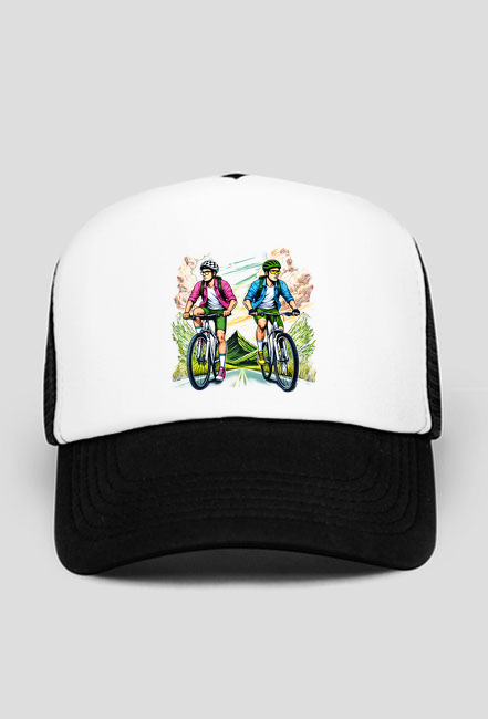 Czapka z Daszkiem typu TRUCKER - Dwaj Młodzi Kolarze Jadący Przez Górzysty Krajobraz o Świcie SKU: czapka-z-daszkiem-trucker_phjm8isk_4778389