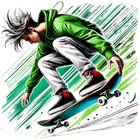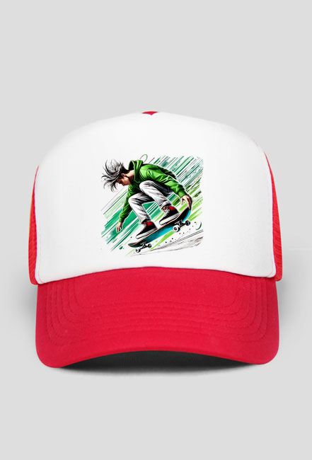 Odkryj moją czapkę z daszkiem typu TRUCKER z dynamiczną ilustracją, przedstawiającą stylowego chłopaka w zielonej bluzie na deskorolce. Ta nowoczesna grafika jest pełna energii i ruchu, co sprawia, że czapka wyróżnia się wśród innych. Każdy projekt jest ręcznie tworzony, co zapewnia jego unikalny design i wyjątkowy charakter.