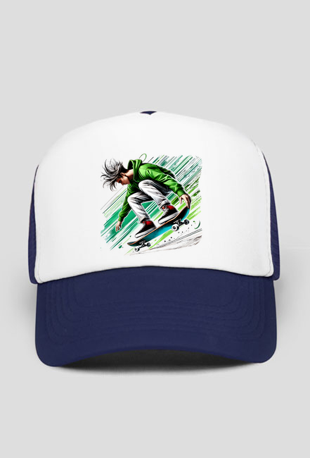 Odkryj moją czapkę z daszkiem typu TRUCKER z dynamiczną ilustracją, przedstawiającą stylowego chłopaka w zielonej bluzie na deskorolce. Ta nowoczesna grafika jest pełna energii i ruchu, co sprawia, że czapka wyróżnia się wśród innych. Każdy projekt jest ręcznie tworzony, co zapewnia jego unikalny design i wyjątkowy charakter.