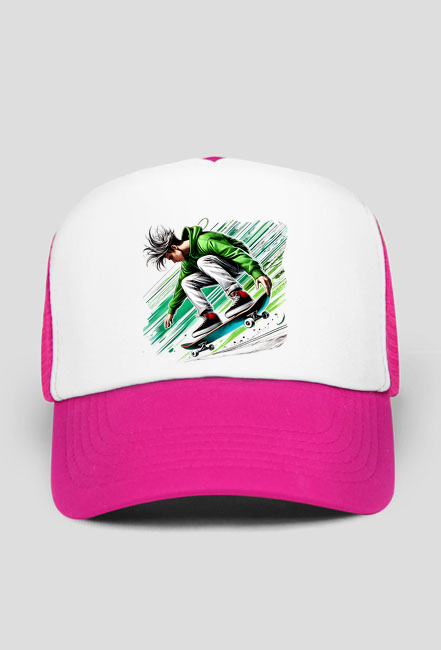 Odkryj moją czapkę z daszkiem typu TRUCKER z dynamiczną ilustracją, przedstawiającą stylowego chłopaka w zielonej bluzie na deskorolce. Ta nowoczesna grafika jest pełna energii i ruchu, co sprawia, że czapka wyróżnia się wśród innych. Każdy projekt jest ręcznie tworzony, co zapewnia jego unikalny design i wyjątkowy charakter.