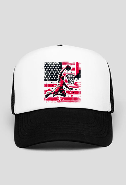 Czapka z daszkiem typu trucker z motywem koszykówki i patriotyzmu: Amerykański sport w sztuce ulicznej na stylowej czapce SKU: czapka-z-daszkiem-trucker_bk8o1of7_4775743