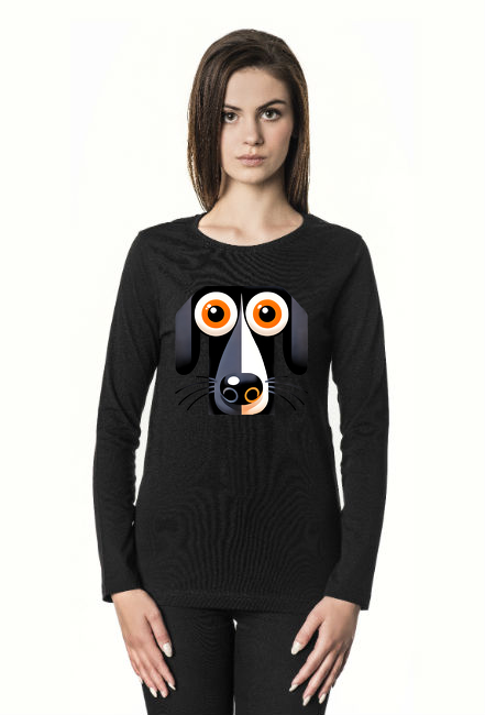 Damska Koszulka z Długim Rękawem - Czarno-Szary Pies Ilustracja z Dużymi Pomarańczowymi Oczami - Unikalna Grafika Dla Miłośników Zwierząt SKU: premium-longsleeve-ladies-voyage_f3qoc3hp_4779437