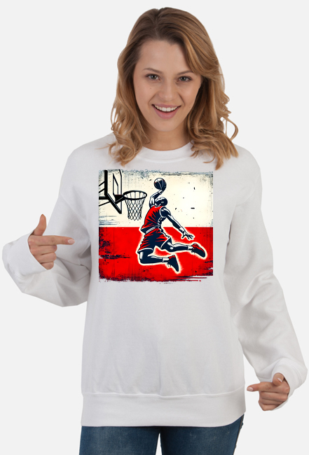 Dynamiczna grafika polskiego koszykarza wykonującego wsad na tle flagi Polski w stylu graffiti - Bluza Damska Klasyczna SKU: bluza-damska-B04_of4co1tz_4776453
