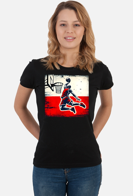 Dynamiczna grafika polskiego koszykarza wykonującego wsad na tle flagi Polski w stylu graffiti - Koszulka Damska SKU: koszulka-damska-K02_qgpbz14s_4776445