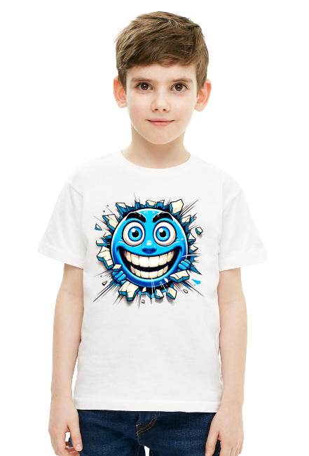 Poznaj moją najnowszą propozycję - Ekstrawagancka niebieska twarz przełamująca mur w komiksowym stylu na koszulce dla chłopców. Ta koszulka, ozdobiona unikalnym, ręcznie tworzonym nadrukiem, przedstawia niebieską twarz w komiksowym stylu, która dynamicznie przełamuje mur. Grafika ta, pełna energii i ekstrawagancji, z pewnością przyciągnie wzrok i wyróżni Twoje dziecko z tłumu.