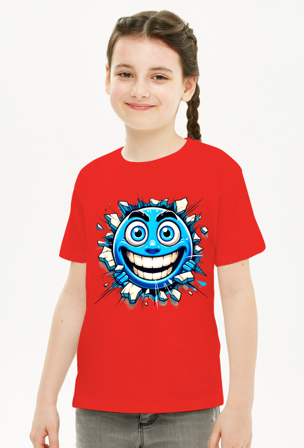 Poznaj moją najnowszą propozycję - Ekstrawagancka niebieska twarz przełamująca mur w komiksowym stylu na koszulce dla dziewczynek. Ta koszulka, ozdobiona unikalnym, ręcznie tworzonym nadrukiem, przedstawia niebieską twarz w komiksowym stylu, która dynamicznie przełamuje mur. Grafika ta, pełna energii i ekstrawagancji, z pewnością przyciągnie wzrok i wyróżni Twoje dziecko z tłumu.
