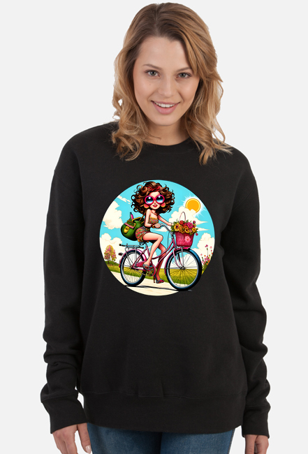 Klasyczna bluza damska z nadrukiem "Stylowa dziewczyna na rowerze w stylu retro z koszem pełnym kwiatów" – wysoka jakość i modny design SKU: bluza-damska-B04_gn1bxd4j_4775715