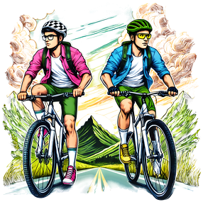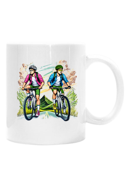 Ten klasyczny kubek z grafiką "Dwaj Młodzi Kolarze Jadący Przez Górzysty Krajobraz o Świcie" to doskonały wybór dla wszystkich miłośników kolarstwa i górskich przygód. Grafika przedstawia dynamicznych kolarzy na rowerze, przemierzających malowniczy krajobraz gór o świcie. Komiksowy styl oraz intensywne kolory dodają kubkowi wyjątkowego charakteru, który wyróżnia go spośród innych.