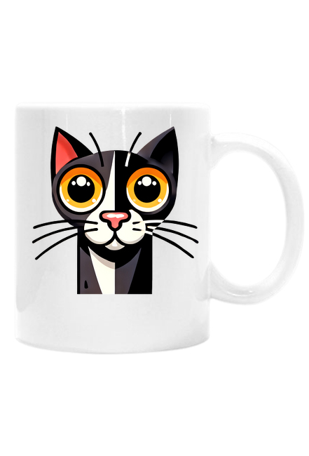 Produkt - KLASYCZNY KUBEK z wyjątkową grafiką przedstawiającą czarno-białego kota z dużymi, hipnotyzującymi oczami to idealny wybór dla miłośników zwierząt. Ta kocia ilustracja to prawdziwe dzieło sztuki cyfrowej, które łączy w sobie elementy abstrakcji i uroku. Kot animowany z kocią twarzą i dużymi oczami z pewnością przyciągnie uwagę i wywoła uśmiech na twarzy każdego, kto zobaczy ten kubek.