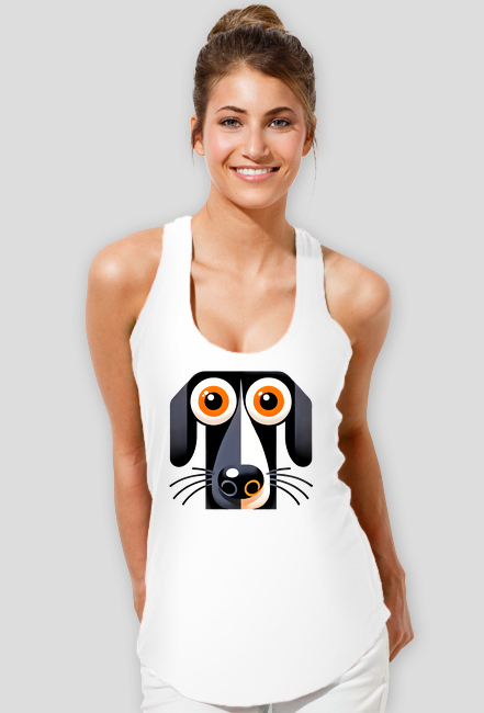 Koszulka Damska Bokserka - Czarno-Szary Pies Ilustracja z Dużymi Pomarańczowymi Oczami - Unikalna Grafika Dla Miłośników Zwierząt SKU: koszulka-bokserka-damska_l6whskmh_4779409