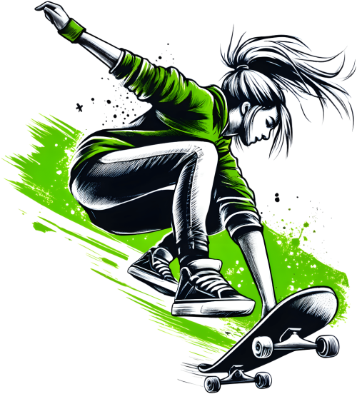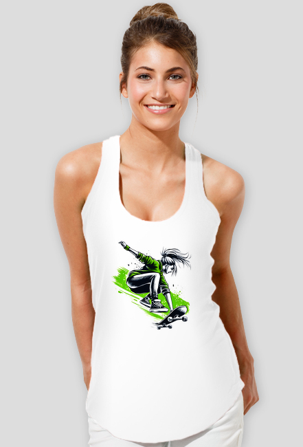 Koszulka Damska Bokserka - Ekstremalna jazda na deskorolce: Skok dziewczyny w zielonej bluzie z artystycznym zielonym tłem SKU: koszulka-bokserka-damska_95owh6pd_4777524