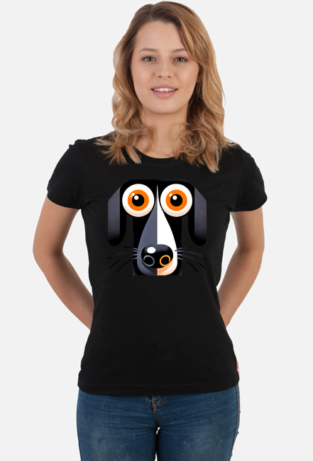 Koszulka Damska - Czarno-Szary Pies Ilustracja z Dużymi Pomarańczowymi Oczami - Unikalna Grafika Dla Miłośników Zwierząt SKU: koszulka-damska-K02_sqxs0r1i_4779412