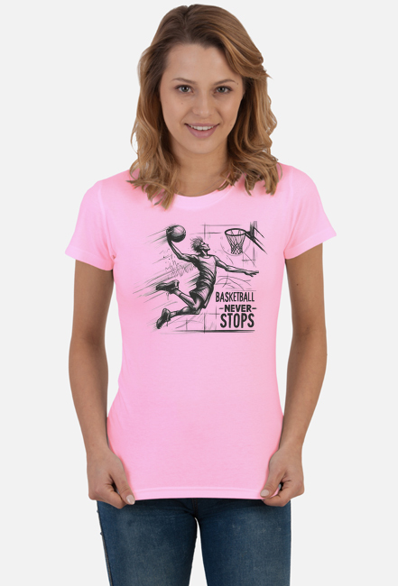 Koszulka Damska - Dynamiczna grafika koszykarza w locie z hasłem 'Basketball Never Stops' SKU: koszulka-damska-K02_as7qp1c7_4781690