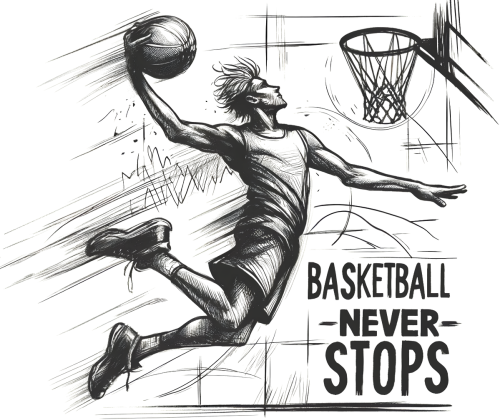 Koszulka damska z dynamiczną grafiką koszykarza w locie, opatrzoną hasłem "Basketball Never Stops". Ta sportowa grafika doskonale oddaje energię i pasję do koszykówki, stanowiąc inspirację sportową dla każdej miłośniczki tego sportu. Grafika jest wysokiej rozdzielczości, dzięki czemu każdy szczegół, od piłki po szkic koszykarza, jest wyraźny i imponujący.