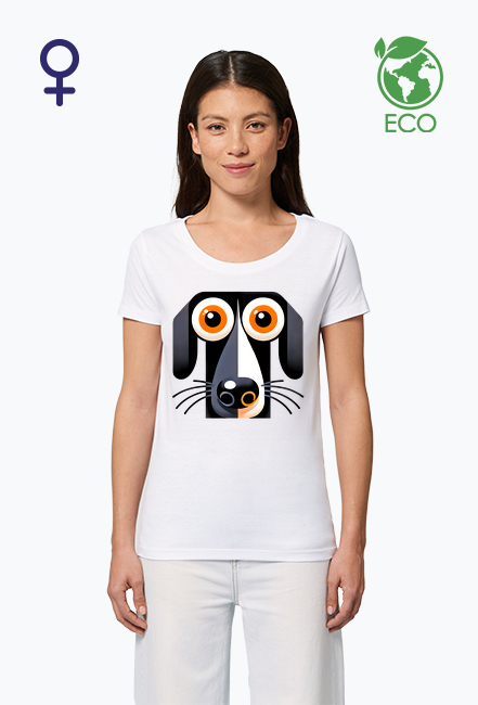 Koszulka Damska ECO - Czarno-Szary Pies Ilustracja z Dużymi Pomarańczowymi Oczami - Unikalna Grafika Dla Miłośników Zwierząt SKU: eco-koszulka-damska-Eco-koszulka-damska_sx0856fe_4779446