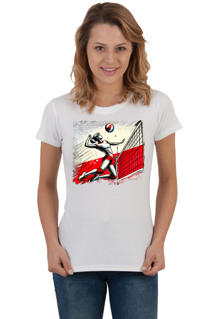 Koszulka Damska "Polska siatkarka w akcji – energiczne uderzenie piłki na tle stylizowanej flagi Polski, pop-art vintage styl graffiti, czerwień, biel i czerń" SKU: koszulka-damska-K02_rt9rzr5x_4776599