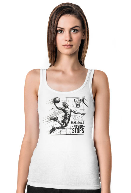 Koszulka Damska Tank Top - Dynamiczna grafika koszykarza w locie z hasłem 'Basketball Never Stops' SKU: koszulka-damska-tank-top_eo8mxrj3_4781700