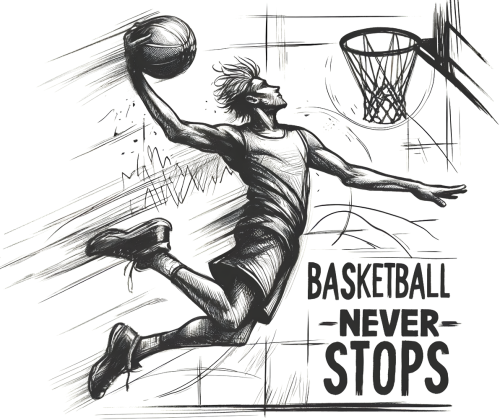 Koszulka damska tank top z dynamiczną grafiką koszykarza w locie, opatrzoną hasłem "Basketball Never Stops". Ta sportowa grafika doskonale oddaje energię i pasję do koszykówki, stanowiąc inspirację sportową dla każdej miłośniczki tego sportu. Grafika jest wysokiej rozdzielczości, dzięki czemu każdy szczegół, od piłki po szkic koszykarza, jest wyraźny i imponujący.