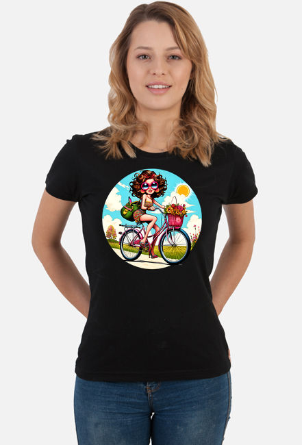 Koszulka damska z nadrukiem "Stylowa dziewczyna na rowerze w stylu retro z koszem pełnym kwiatów" – modna i wygodna na co dzień SKU: koszulka-damska-K02_sqaqqy41_4775696