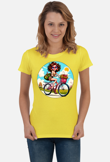 Koszulka damska z nadrukiem "Stylowa dziewczyna na rowerze w stylu retro z koszem pełnym kwiatów" – modna i wygodna na co dzień SKU: koszulka-damska-K02_sqaqqy41_4775696