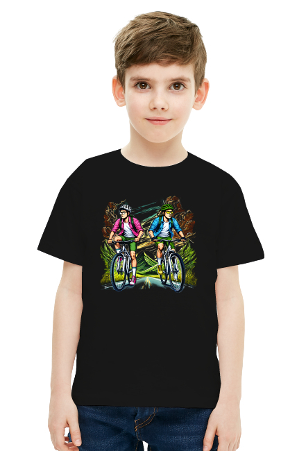 Koszulka Dla Chłopców - Dwaj Młodzi Kolarze Jadący Przez Górzysty Krajobraz o Świcie SKU: koszulka-chlopiec-new_hy9qn18f_4778356