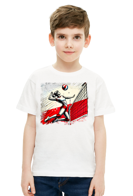Wprowadź do garderoby swojego dziecka prawdziwą dawkę sportowej energii i patriotyzmu dzięki mojej koszulce dla chłopców. Grafika przedstawia dynamiczny design polskiej siatkarki w akcji, uchwyconej w momencie energicznego uderzenia piłki nad siatką na tle stylizowanej flagi Polski. Utrzymana w intensywnych odcieniach czerwieni, czerni i bieli, koszulka wyróżnia się pop-artowym stylem z elementami vintage graffiti.