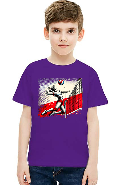 Wprowadź do garderoby swojego dziecka prawdziwą dawkę sportowej energii i patriotyzmu dzięki mojej koszulce dla chłopców. Grafika przedstawia dynamiczny design polskiej siatkarki w akcji, uchwyconej w momencie energicznego uderzenia piłki nad siatką na tle stylizowanej flagi Polski. Utrzymana w intensywnych odcieniach czerwieni, czerni i bieli, koszulka wyróżnia się pop-artowym stylem z elementami vintage graffiti.
