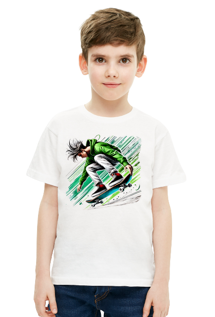 Koszulka Dla Chłopców Stylowy Chłopak w Zielonej Bluzie na Deskorolce – Dynamiczna Ilustracja SKU: koszulka-chlopiec-new_o97xutp2_4777610