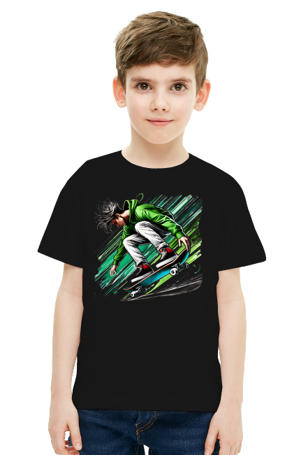 Koszulka Dla Chłopców Stylowy Chłopak w Zielonej Bluzie na Deskorolce – Dynamiczna Ilustracja SKU: koszulka-chlopiec-new_o97xutp2_4777610