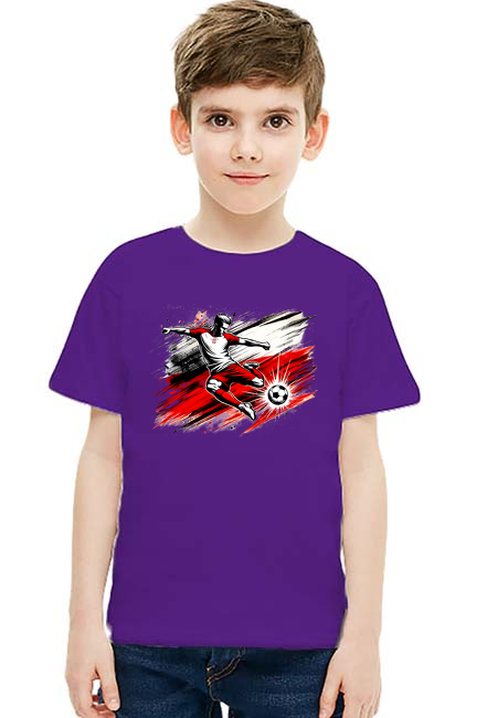 Koszulka dla chłopców z dynamiczną grafiką polskiego piłkarza w akcji na tle stylizowanej flagi Polski w stylu pop-art SKU: koszulka-chlopiec-new_oref00gf_4776737