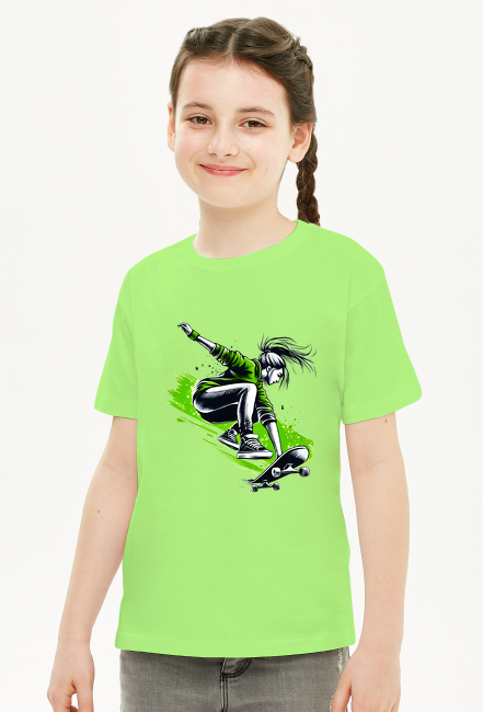 Koszulka Dla Dziewczynek - Ekstremalna jazda na deskorolce: Skok dziewczyny w zielonej bluzie z artystycznym zielonym tłem SKU: koszulka-dziewczynka-new_gcsgp0u8_4777513