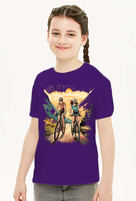 Ta urocza koszulka dla dziewczynek z grafiką "Rowerowe uniesienia w królestwie gór – Wyjątkowa przygoda na ścieżkach przy zachodzie słońca" to idealny wybór dla młodych miłośniczek rowerowych przygód. Wspaniała grafika przedstawia dziewczynki na rowerach, przemierzające malownicze trasy górskie przy zachodzie słońca, co wprowadza w nastrój pełen przygody i ekscytacji.